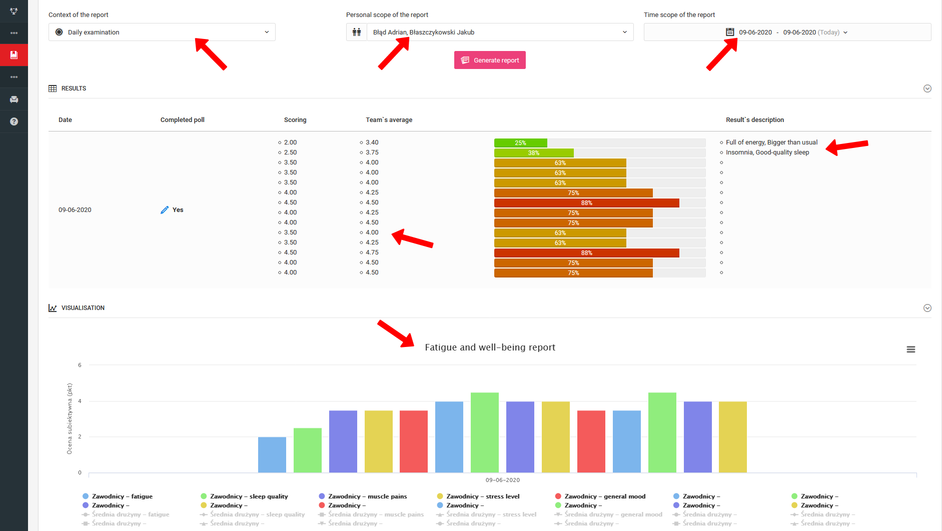 The results presented in the reports provide you with an analysis of both unitary, per each measurement (day, workout, match) and collective statements in the form of graphs aggregating data on one timeline. Moreover, the analysis will show the percentage change of results compared to the last survey and the dominant response among players.