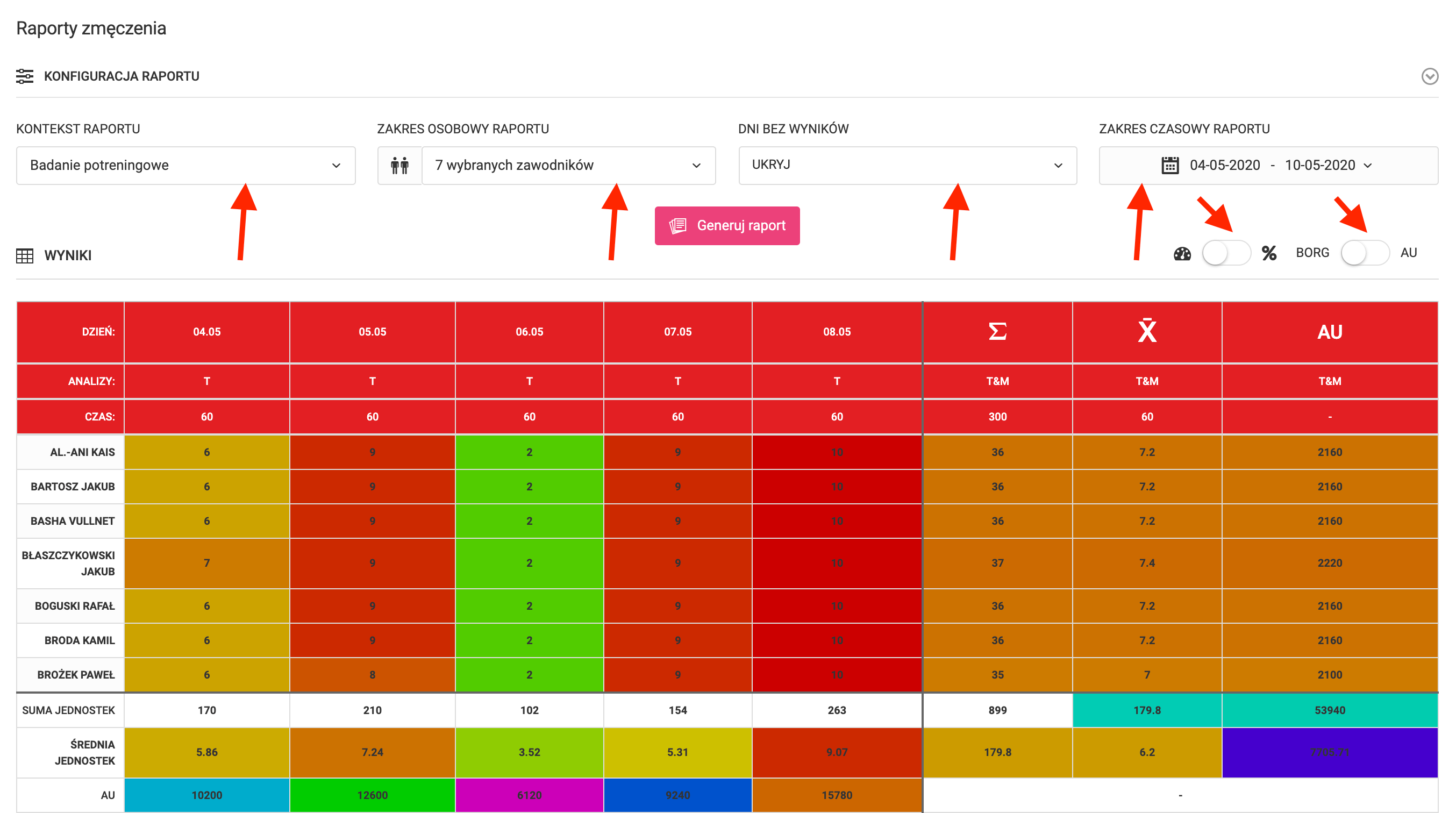 A summary report is also available in the system, showing a very wide range of data with analyses. Above the report table, there is a configurator available. As in the case of detailed reports, you can choose what type of studies should appear in the table. You can select which players are to be included in the report, mark the time range of the report and also hide days without measurements. On the right-hand side above the table, you have two sliders that affect the way data is presented. The first one is responsible for changing the way the results are calculated - you can choose a numerical or a percentage value. In the second slider, you determine whether the data is to be presented as a scale value or as calculated fatigue units (AU). Remember to confirm each change in the report configuration and analysis with the pink "generate report" button. The table itself contains several types of data. In the columns with the dates in the headers, you have the data about the specific results entered by the player. The columns can refer to daily, post-training and post-match tests. The columns behind the darker thicker line refer to the total, average and fatigue units (AU) of the players over the selected time period. In the lines below the darker-thick line, we have summaries of the results of each test for the whole team. The colors used in the table correspond to the colors that the players have to choose when completing the survey. Green - light fatigue, dark red - maximum fatigue.