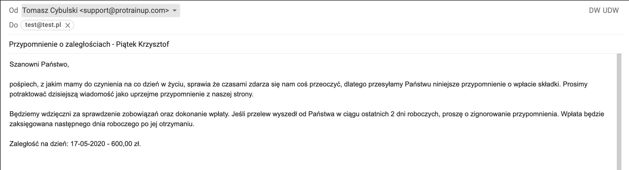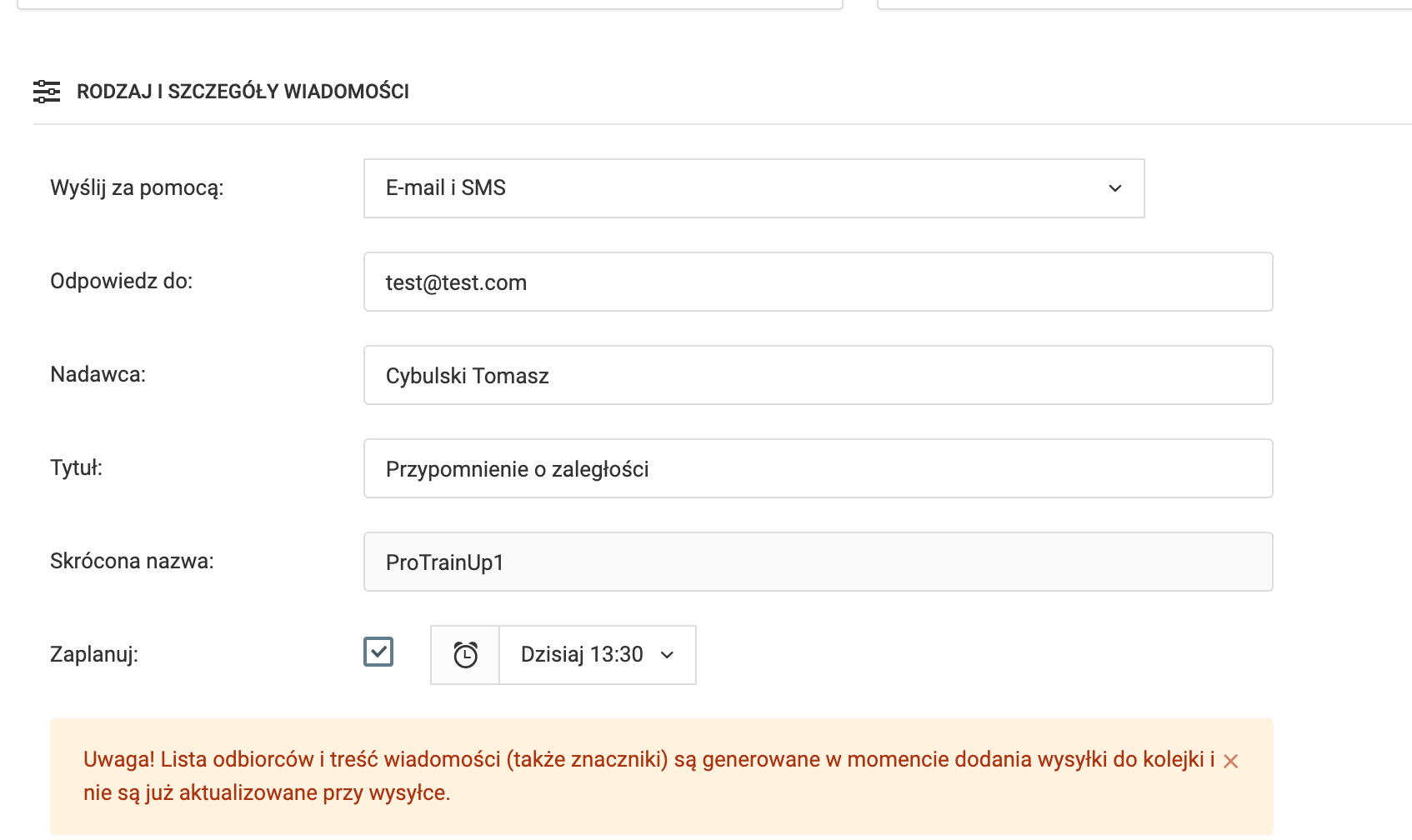 You can also choose which address you want the reply to be sent to, who is the sender of the message, the title of the message and the abbreviated name that will be visible as the sender in case of sending an SMS. The default name is ProTrainUp, but if you want to set your own name, please contact us. You can also schedule your message sending time for up to 72 hours.