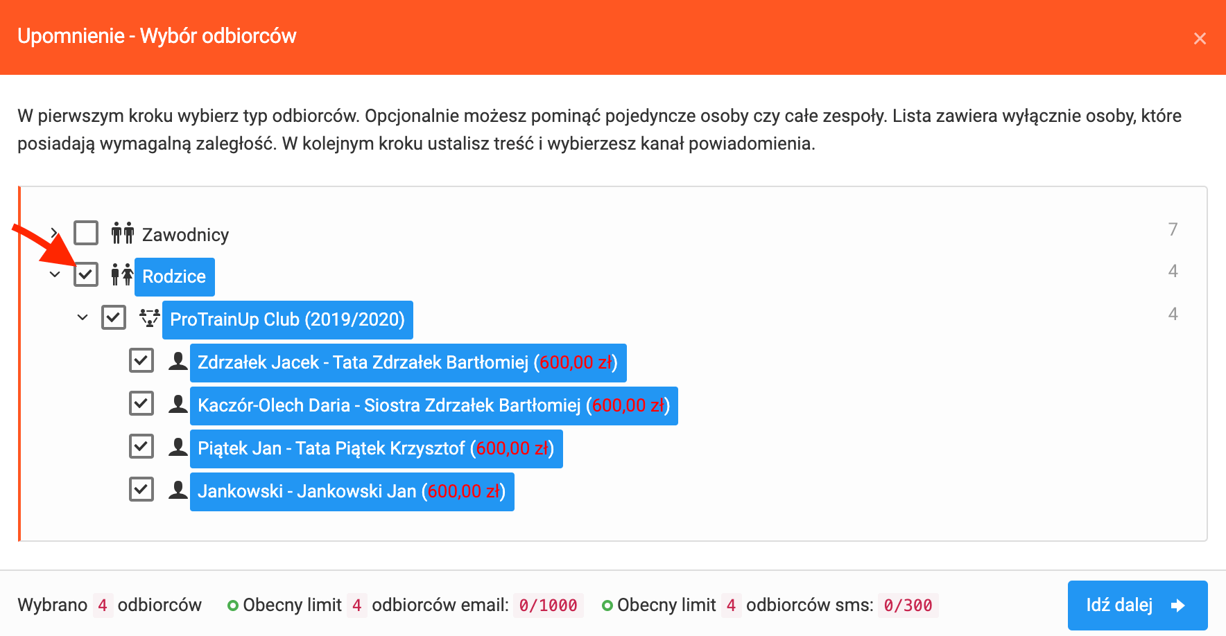 In the recipient selection window, you have to select the people to whom you will send a reminder. By default, the system selects all persons who have any current arrears. Of course, the final decision to whom the notification will be sent is up to you.