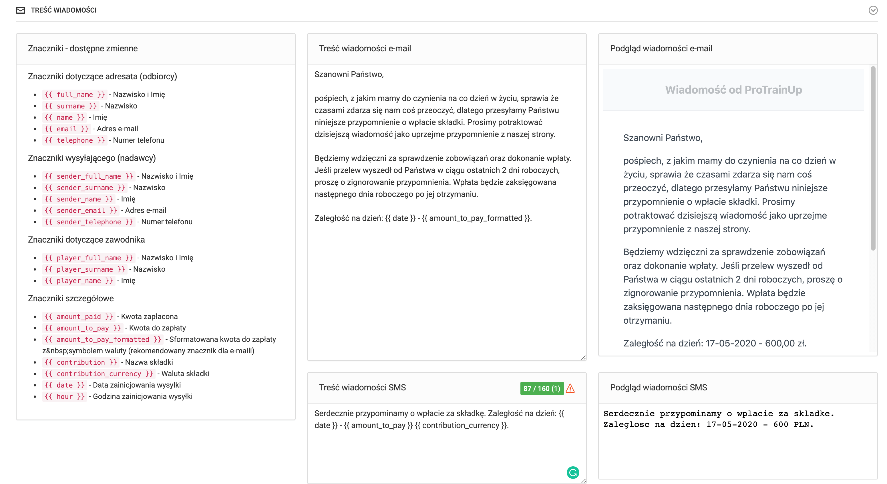 The next step is to prepare the message content. In the case of a fee reminder, the message content is generated dynamically for each recipient. The value of the arrears on the day of planning a shipment automatically appears. Moreover, you have the possibility to insert dynamic tags, which you will find on the left side of the form (red text). By placing them in the content, the system will automatically insert the, for instance, the recipient's name into each message.