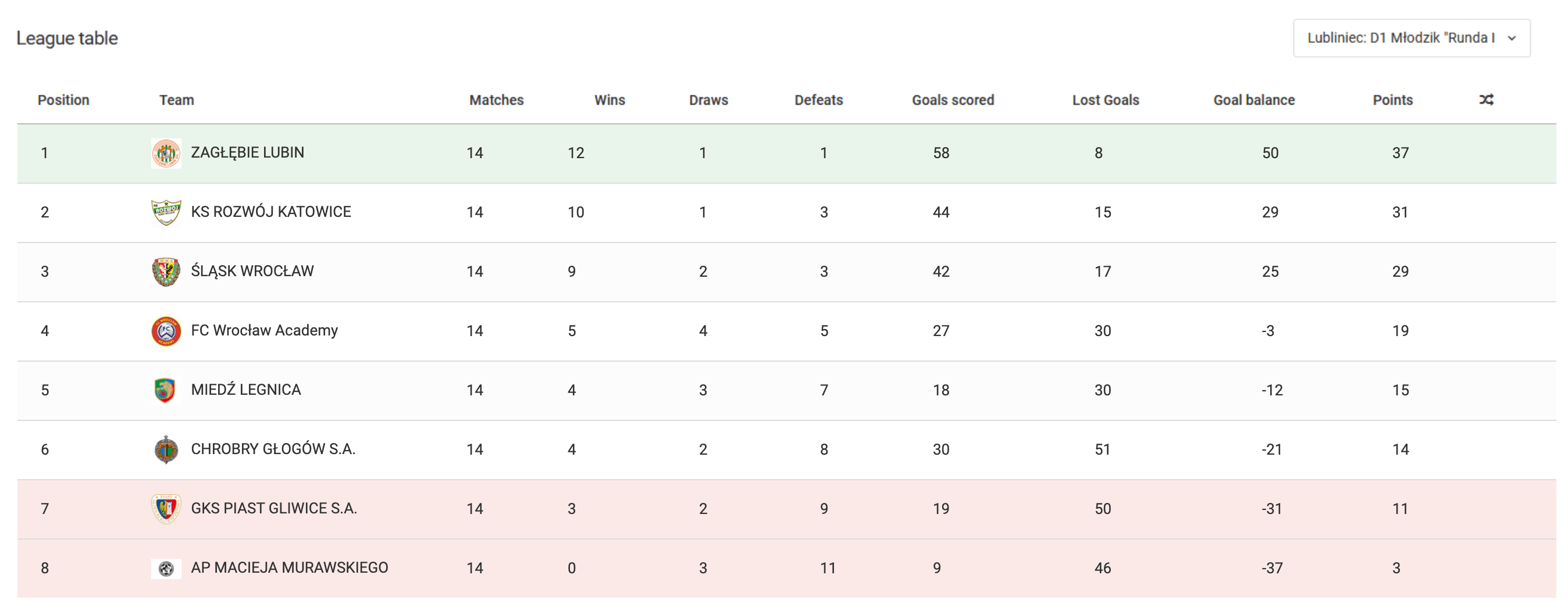 Based on the game parameters and match results entered into the system, a league table is automatically generated for each game.