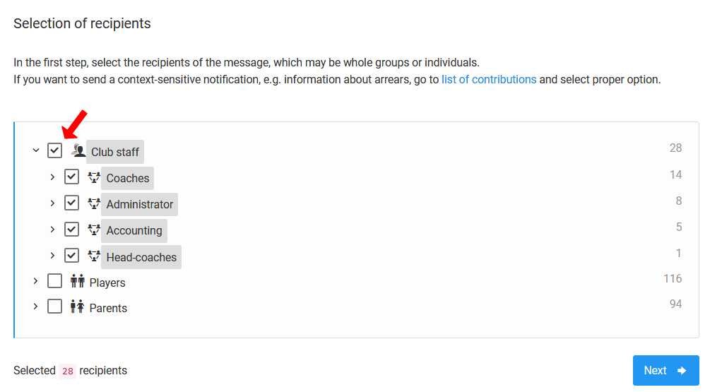 As you can see, when you create a campaign from scratch, you have the opportunity to choose the recipients of the message even more precisely. You can prepare campaigns only for club staff, parents, players or all at once. In fact, you can prepare an information campaign with targeting limited to one person.