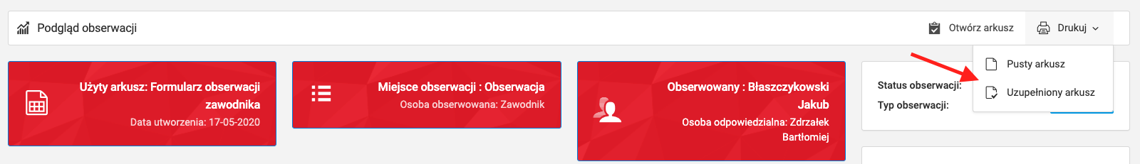 As mentioned in the chapter on observation, the observation preview screen shows the most important data regarding the evaluation. At the top, you can see data ranging from the type of observation and who was observed to which sheet was used. In the top right corner, there is a print button. You can print both empty and completed sheet in PDF format.