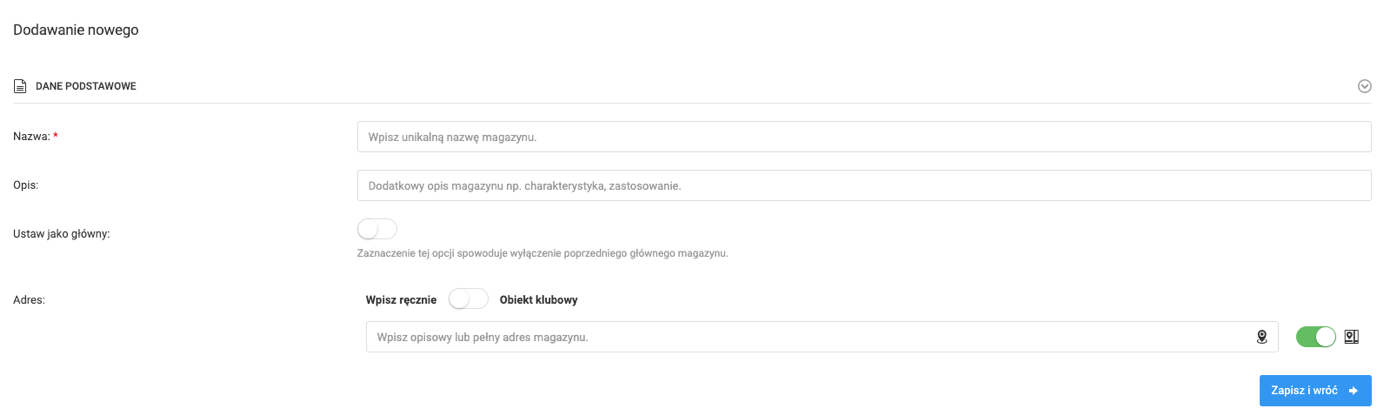 Adding a warehouse consists of filling in a few blank fields. Name is the only mandatory field to fill. You can also write a description, set it as the main warehouse and specify its location. Then press the "Save and back" button in the right bottom corner.
