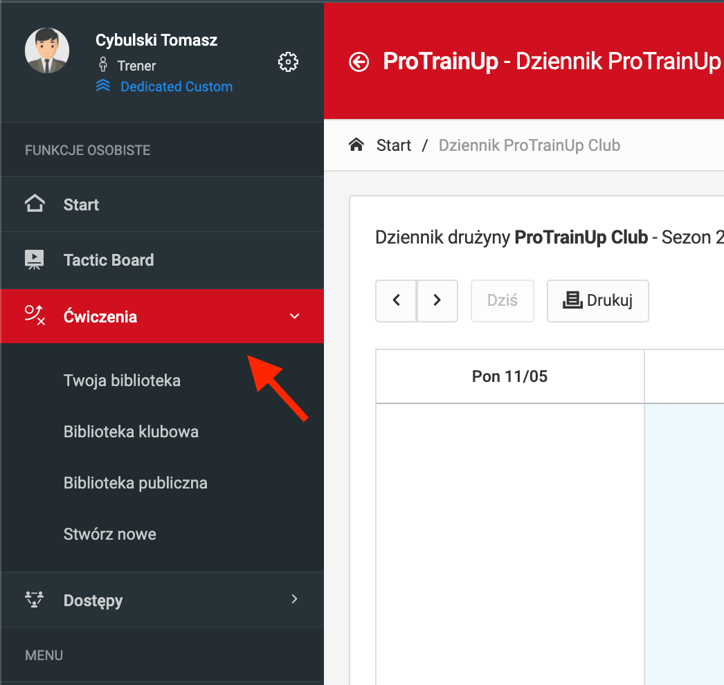 Aby wejść do konkretnej biblioteki, należy z lewego menu wybrać opcję "ćwiczenia" i kliknąć w interesującą Cię bibliotekę ćwiczeń.